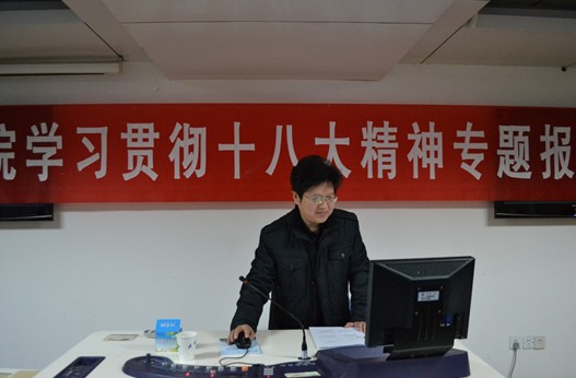 专题报告结束后,学院党委书记黄佐斌对报告作了总结并对全体师生员工贯彻落实党的十八大精神提出了具体要求。他指出,程教授的报告对学院师生结合自身实际和学科专业推动学院科学发展具有重要意义。针对贯彻落实好党的十八大精神,他要求,一是要从领会精神实质上下功夫,要原原本本地认真研读党的十八大报告和党章修正案,准确把握十八大确定的重要理论观点以及中央作出的重大战略部署;二是要在联系实际推动发展上下功夫,要将十八大精神与推动学院科学发展、加强学院党建、做好党员的本职工作等结合起来,充分发挥党支部的战斗堡垒作用和党员的先锋模范作用,加强党的先进性建设和纯洁性建设。学院各个党支部要围绕贯彻落实十八大精神,积极开展主题突出、形式多样的主题党日活动,切实把学院部署的“五个一”活动落到实处。