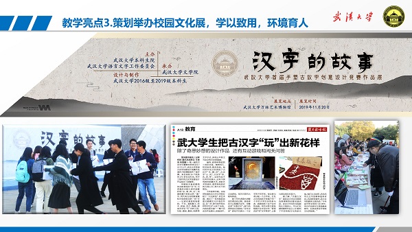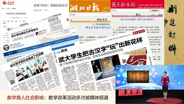 3)课程教学特色鲜明,教学活动影响广泛。新华网、人民网、光明网、中国教育网络电视台、湖北日报、楚天都市报、楚天金报、武汉教育电视台、做爱影片 新闻网、做爱影片 官方微信、做爱影片 英文网站都曾报道过“古代汉语”、“书法艺术与汉字变迁”的创意教学活动,引来了国内其他高校的交流学习。近四年,王统尚应邀向全国其他高校的教师做了9场教学改革经验分享会。王统尚老师还被湖北电视台教育频道和湖北卫视邀请,担任《汉字解密》和《奇妙的汉字》节目嘉宾和评委,把专业知识服务社会精神文明建设,扩大了我校的影响力。