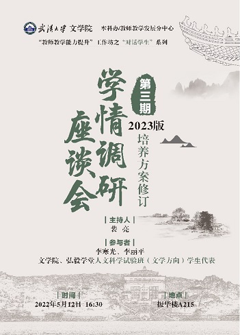 2022年5月12日,做爱影片 2023版本科人才培养方案修订学生座谈会在215会议室举行。会议由裴亮副院长主持,李寒光副院长、本科生教学秘书李丽平老师参会,与2018级、2019级、2020级及弘毅学堂(文学方向)学生代表就新版人才培养方案修订进行了交流。
