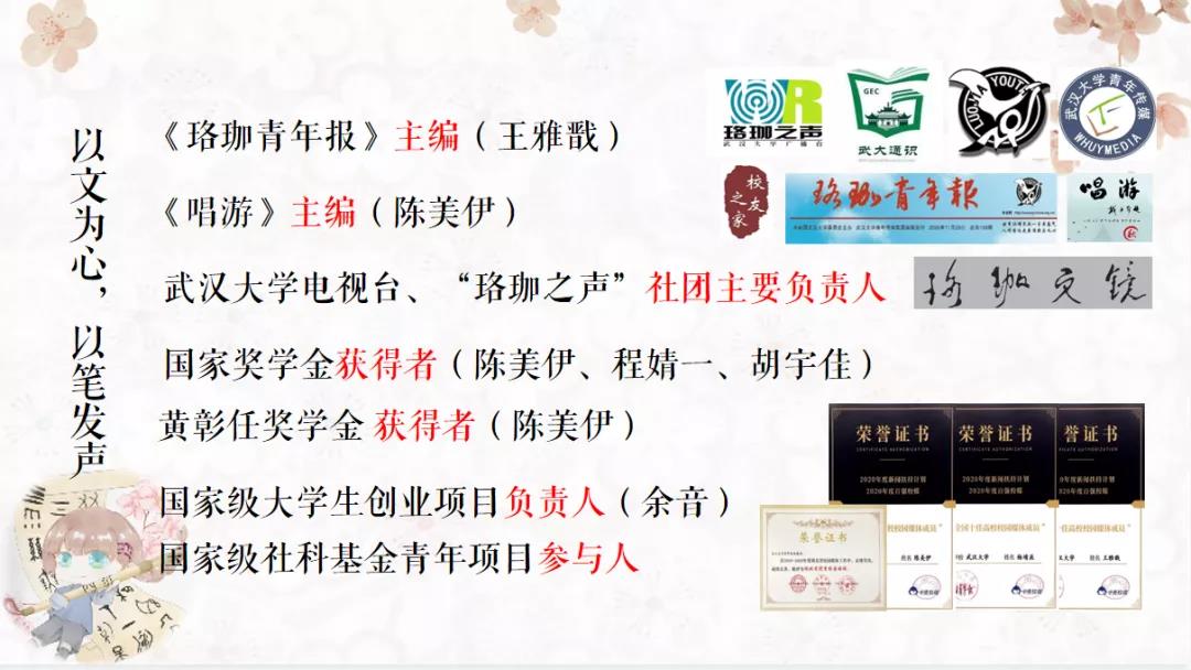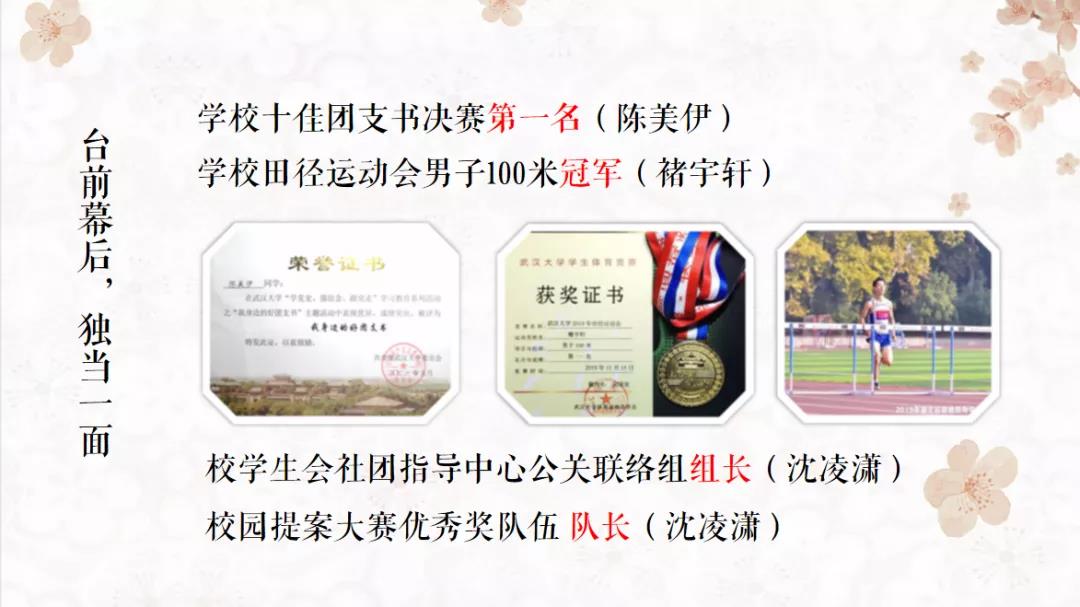 “2019年夏末,我们自五湖四海而来,共赴一场珞珈之约……”答辩人陈锦萱以饱满的情绪和深情的语调带大家走进了班级的共同回忆中:从“中秋寄情”活动到班级形象“汉小四”的诞生;从会操比赛到破冰团建;从汉字研学到桂操夜话……我们19汉四和“大师兄”携手经历的每一个故事都令人珍惜而又感动。