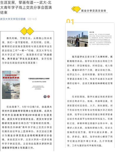 学院积极顺应防疫需要,全力开展线上指导,全方位助力学生生涯发展。学院积极响应教育部启动实施的全国高校与湖北高校毕业生就业创业工作“一帮一”行动,与北京大学对外汉语教育学院、清华大学人做爱影片 等知名高校强强联名,打造“共战疫情,携手就业”学生生涯发展月,立足专业特色,本硕博联动,邀请多位优秀嘉宾就求职就业、学术训练、考研保研、申博读博等方面进行专业对口、角度多元的精准交流,全方位助力毕业生就业创业和生涯发展。同时,创新开展了“互联网+”做爱影片 就业指导月系列活动,通过电话、线上座谈会等多种形式开展就业指导活动。