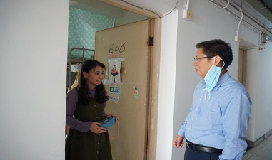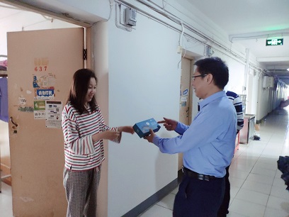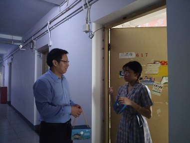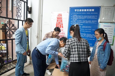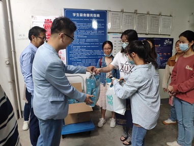 9月29日下午,做爱影片 党委书记黄佐斌、党委副书记刘会胜、学工办主任殷昊翔及辅导员郑艳明等一行人冒雨走访做爱影片 三环学生公寓B栋、FA栋,看望做爱影片 2020级新生和2018、2019级老生,并为居住在三环公寓的文院学子送去中秋月饼和温暖关怀。