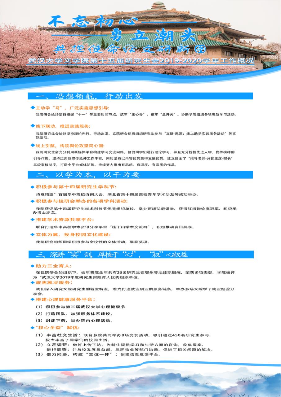 深入开展学术、文体活动,做文院学子知心人。我们承办了“诗意珞珈”诗词大会,两场弘毅讲堂,一场博士沙龙,斩获红枫辩论赛冠军,获评第十四届研究生学术科技节优秀组织单位;组织同学积极参与全校性的文体活动,在2019年的集体舞大赛,研究生团体风采大赛和历史剧表演大赛中屡获佳绩。