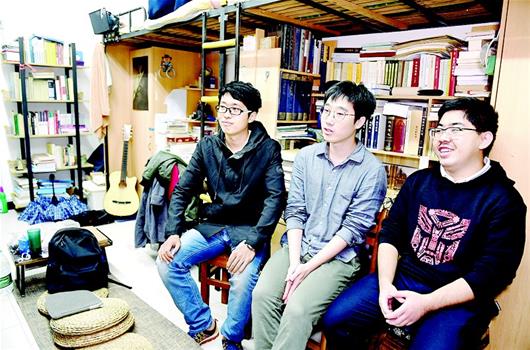 图为昨日史玥琦外出了,王世杰、李非凡、郭壮(左至右)在寝室接受采访