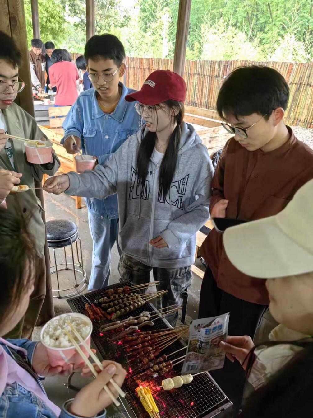 除了土灶组外,自助烧烤组的同学们也热火朝天地穿串、扇火、刷料,还创新性地用现有食材组合出各种新奇美食,景象其乐融融。