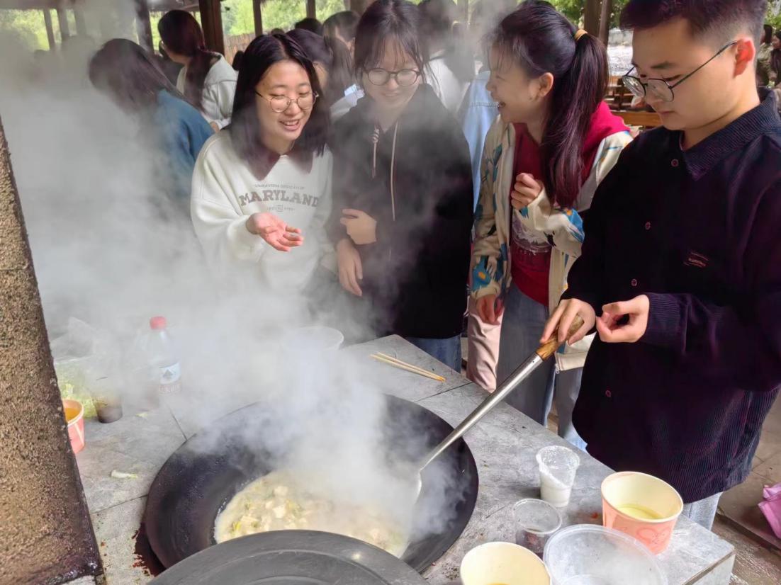 檐外的大雨没有浇灭同学们的热情,在困难面前,大家更加团结。各个小组的同学们分工井然有序,生火、备菜、清洗、炒菜,用农家传统土灶,亲手制作出一道道美味佳肴。