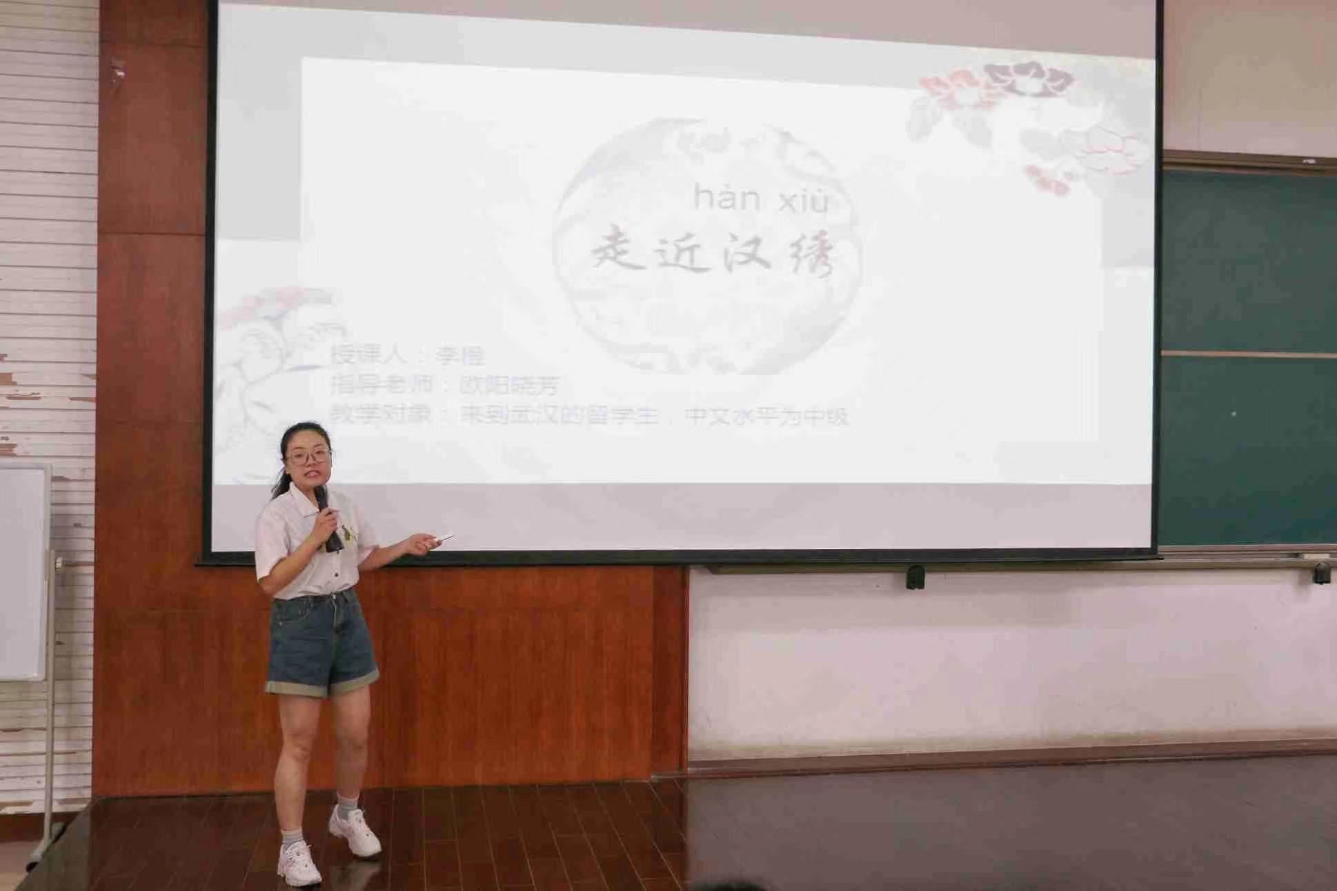 在决赛讲台上,李橙同学以“走近汉绣”为文化教学主题,介绍了荆楚非遗汉绣,进一步延伸到中国刺绣文化和中外刺绣文化的对比,并在其中穿插语言点的教学。除教学展示之外,比赛中还有才艺展示环节,李橙选择了与教学主题相关联的“刺绣”作为才艺展示,精心录制了自己绣制一把“兰花团扇”的全过程,现场辅以专业生动的讲解,充分展现了刺绣艺术的魅力。