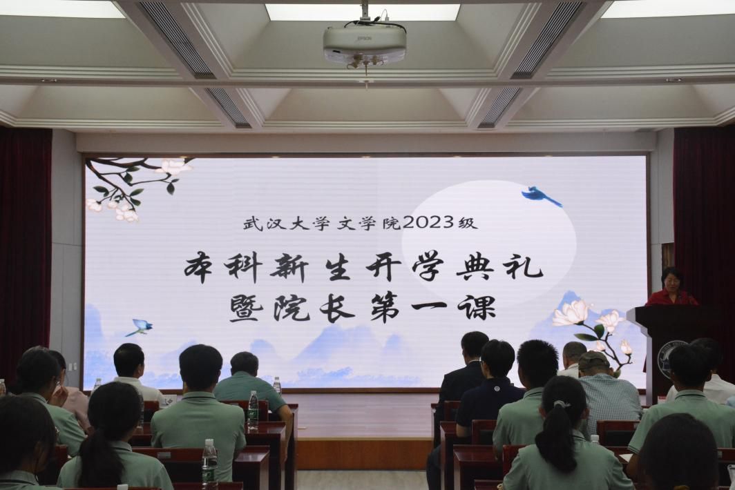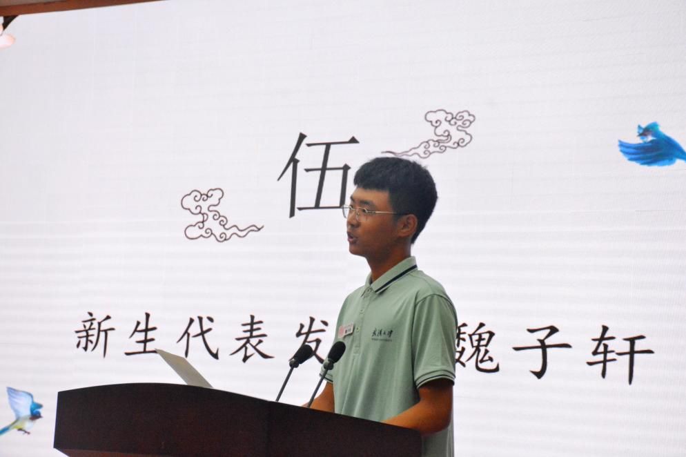 2023级本科新生魏子轩同学作为新生代表发言。他首先表达了自己成为一名“文院人”的喜悦与激动,并表示未来他将紧紧把握课堂,打牢学术根基,注重课后反思,并辅以广泛的阅读加深思考,不断提高自己,做一个有益于国家和人民的人,不辜负老师们的期许,不负珞珈山下的一段青春。