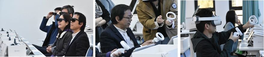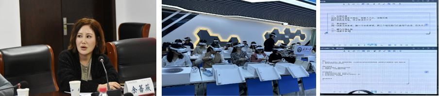接着,厂商技术工程师张启锋就“人工智能写作教学与创研实验室”的建设内容、建设效果、使用情况及售后服务进行详细介绍。该实验室是基于沉浸式虚拟仿真技术、人工智能技术、大数据分析技术结合传统智慧教学理论打造的集沉浸式智慧备课功能、沉浸式智慧授课功能、沉浸式智慧自主学习功能、智慧评学评教功能等功能于一体沉浸式智慧教学与实训环境。目前以沉浸式VR设备为核心,实现与写作多屏控制系统、教学管理系统的立体交互。一方面,通过虚拟仿真的手段,为学生提供包括大观园、巴黎圣母院、喜马拉雅山等在内的9种三维场景体验,解决实体教学运行困难,高成本、高消耗等突出问题。另一方面,便捷的多屏互动具备教学即时反馈、学生演示、同屏广播等多种功能,提升课堂效果。
