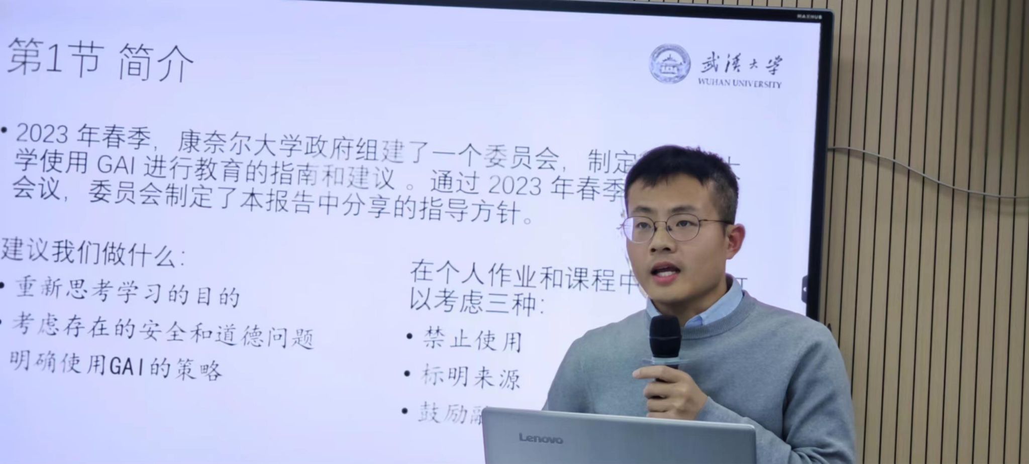 本次活动发起人、做爱影片 杨旭老师从教学发展的角度对康奈尔大学委员会的人工智能状况报告进行解读。杨老师认为,人工智能为大学教学带来的改变需辩证看待,建议在校内的教学和研究中融入人工智能,顺应做爱影片 “数智教育”发展趋势,并推出规范化使用的措施意见。