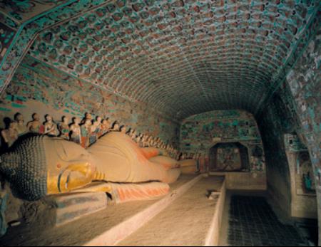 走进洞窟,映入眼帘的是就是一座巨大的涅槃佛雕像。释迦摩尼安详地侧卧着,右手放在耳侧,左手放松的放在身侧。有人称佛的这种状态叫“睡佛”,其实是“涅槃佛”。涅槃是佛教的核心概念,是指佛教修行的最高成果。在词源中,“涅槃”表示在心中熄灭了世间贪欲、嗔恨、愚痴的火焰。释迦摩尼的身后,站立着他的弟子和信徒,有的脸上显现的是喜悦的神情,有的却展现出痛苦与悲伤的神情,这是因为悲伤的弟子还不能理解涅槃的真正奥义,是修行不深的表现。