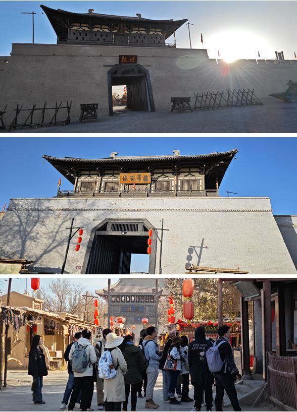上午,迎着清晨的阳光,同学们来到了敦煌古城,准备开始今天的游学之旅。敦煌古城,又称敦煌影视城,位于敦煌市区西南侧。影视古城是1987年中日合拍历史故事片《敦煌》时仿造宋朝沙州古城建设,后来又成为《封神演义》《新龙门客栈》等众多影视剧和综艺节目的取景地。敦煌古城位于大漠戈壁上,融千年西域民俗于一体,城开东、西、南三门,城楼高耸;城内由北宋时期的高昌、敦煌、甘州、兴庆和汴梁五条主要街道组成,点缀以不同地域的过街楼、佛庙、当铺、货栈、丝绸店、酒肆、饭馆、住宅等,作为拍摄用道具,互为背景,相辅相成。