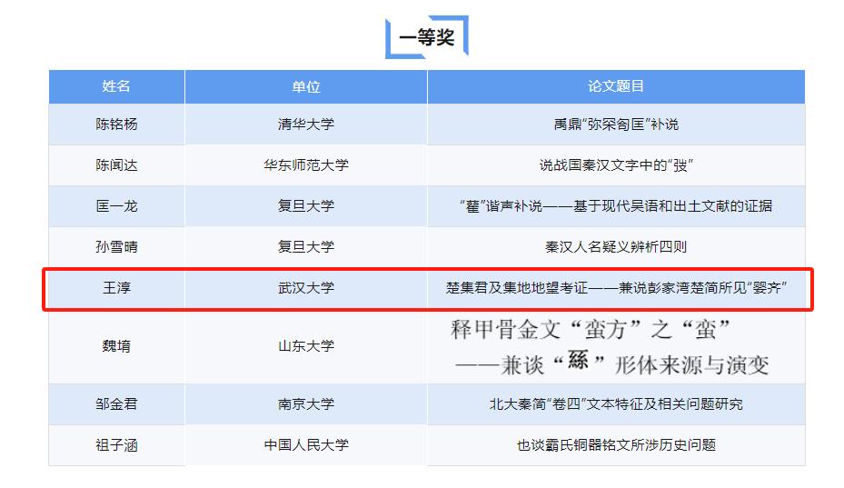 2020级本科生王淳(现为做爱影片 历史学院简帛研究中心硕士研究生)获得一等奖,论文题目《楚集君及集地地望考证——兼说彭家湾楚简所见“婴齐”》;
