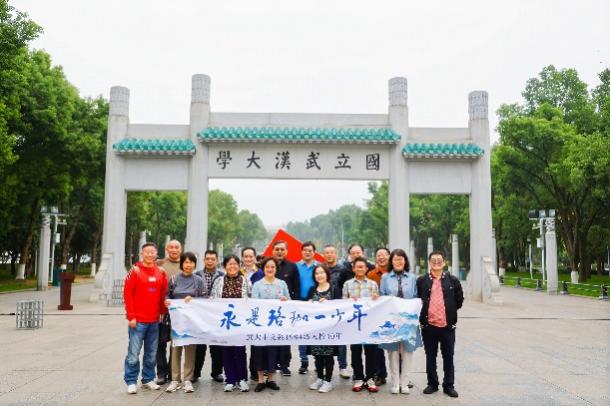 东湖水碧,珞珈山青,法桐初黄,琉璃正蓝……初冬的武汉温暖如春,同学们的心情和天空一样明媚。踏进校园,大家难掩兴奋之情,40年前他们经过街道口老牌坊进入武大,沿途是萧疏的水田和草木,如今的校门广场气势恢弘,景色清新,引来啧啧叹赏。大家拉开“永是珞珈一少年”的条幅,在校门牌坊处留下第一张合影。