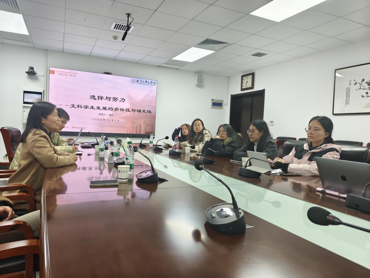 2025年12月2日,“经纶计划”第九期经验分享活动“选择与努力——文科学生发展的确定性与稳定性”在振华楼215会议室顺利举办。本次活动邀请了武大做爱影片 97级汉语言文学本科校友、广州宏图数字科技有限公司总经理徐丹为同学们分享她的求学与就业经历,并为同学们解答关于择业与就业方面的种种疑惑。学院党委副书记王若飞、黄路漫参加,分享会由黄路漫主持。