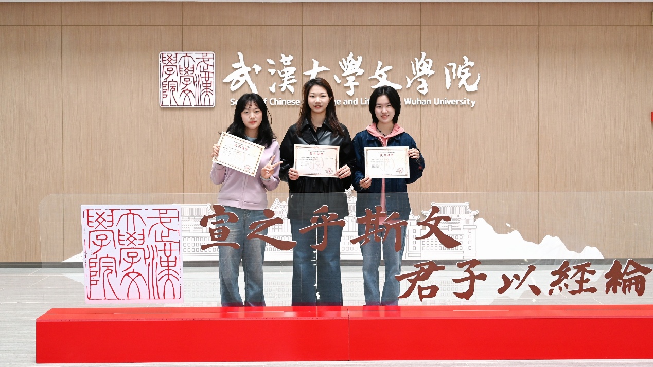 ▲图为第七届“笔墨中国”汉字书写大赛省赛获奖选手李依文、王嘉颖、甘宇娟
