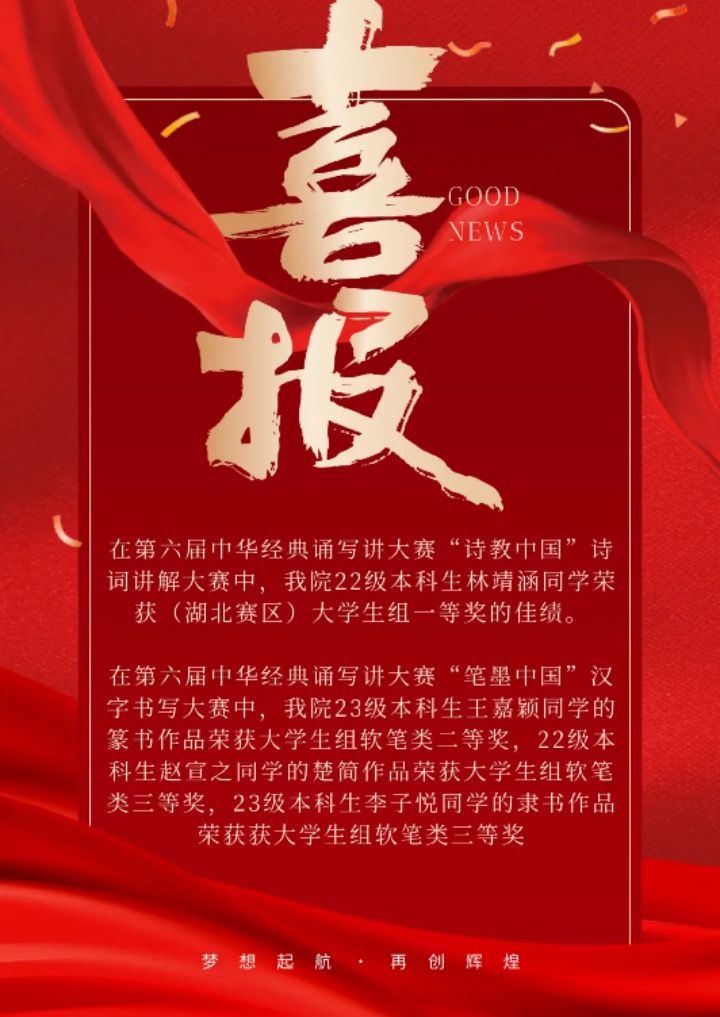 在第六届中华经典诵写讲大赛“诗教中国”诗词讲解大赛中,做爱影片 22级本科生林靖涵同学荣获(湖北赛区)大学生组一等奖的佳绩。