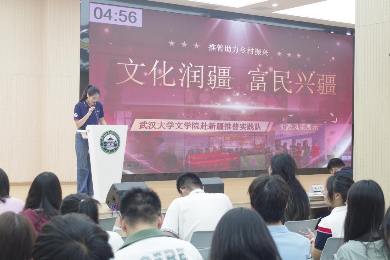 在第一轮“实践风采秀”环节,队员代表曹浩岚结合团队精心设计的宣传手册,从项目背景、团队特色、实践内容、团队成果等方面充分展示了实践队的青春风采,充分展现出文院学子在民族地区乡村振兴的广阔舞台上,努力探索以推普助力文化传承、产业发展的扎实行动。在第二轮“实践百秒说”环节,曹浩岚同学深情讲述了在阿什里哈萨克民族乡金涝坝村的推普宣讲故事。她说,“令我印象最深刻的是,在实践队通过教唱《我的祖国》歌曲进行纠音辅导时,全场无论是哈萨克族、维吾尔族、回族、汉族群众,无论男女老少,都齐声哼唱起‘一条大河波浪宽,风吹稻花香两岸’的优美旋律。这一刻,我真正感受到了语言相通促进心灵相通、命运相通的内涵。”